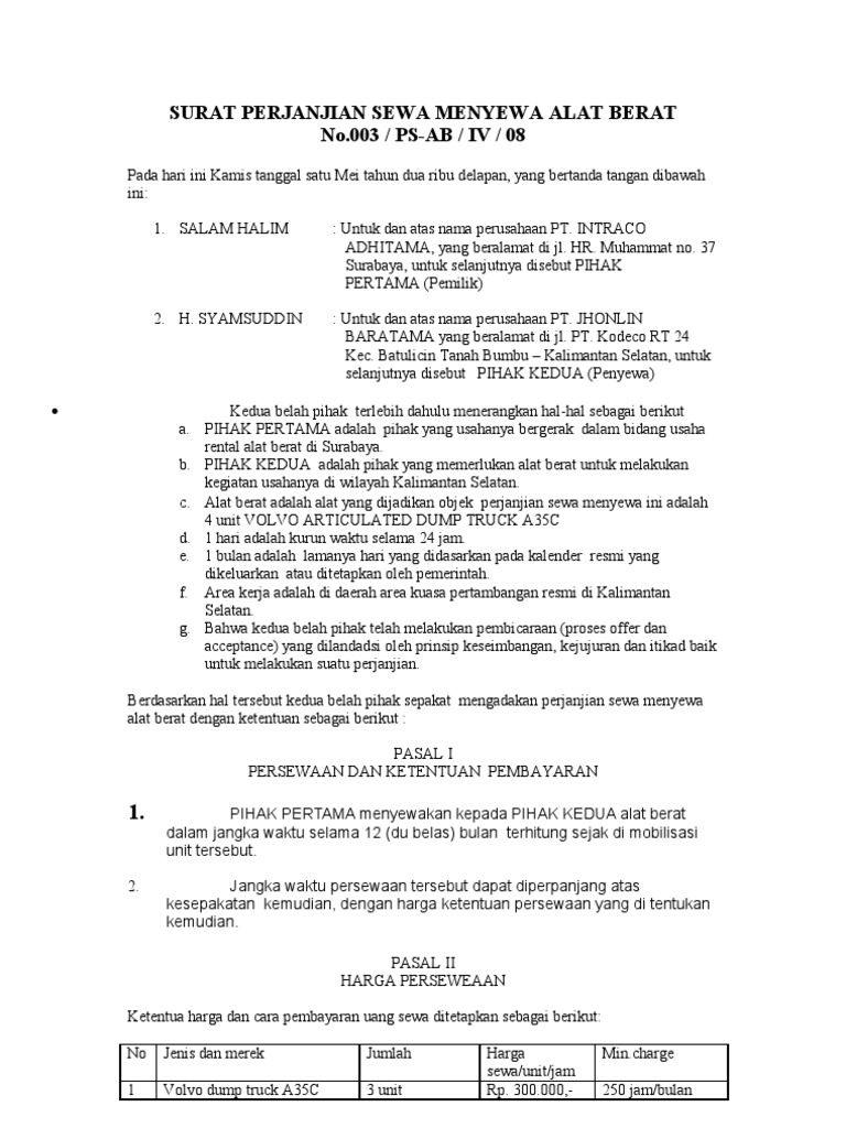 Surat Perjanjian Sewa Menyewa Alat Berat Pdf