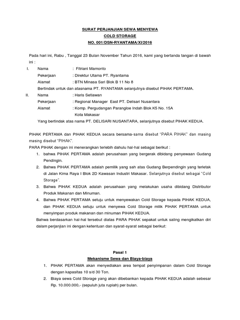 Surat Perjanjian Sewa Menyewa Cold Storage Dsn Makasar Pdf